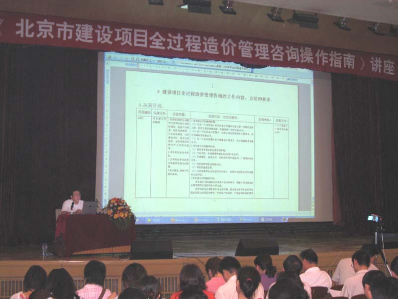 為更好的貫徹落實《指南》的執行,2007年8月8日,由北京市建設工程造價管理協會組織,在中國建筑科學研究院禮堂舉辦了《北京市建設項目全過程造價管理咨詢操作指南》講座,對全市三百多家工程造價咨詢企業進行《指南》的宣貫,由公司董事長周和生對《指南》的操作作了全面的介紹和重點的講解。