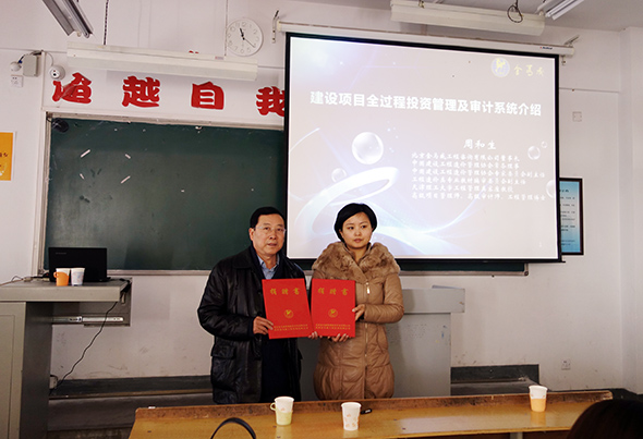 2014年12月16日上午,我公司董事長周和生先生向內蒙古建筑職業技術學院工程管理學院捐贈“建設項目全過程投資管理及審計系統”軟件,并向學院師生們講授“建設項目投資管理及審計信息化”課程,大力支持學校教學工作。