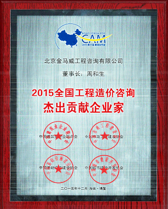 2015年12月25日,由中國建筑業(yè)企業(yè)聯(lián)合會發(fā)起,聯(lián)合中國基礎(chǔ)設(shè)施建設(shè)協(xié)會、中國市政工程建設(shè)協(xié)會等單位聯(lián)合主辦的“博鰲論壇·2015(筑業(yè)年會”在海南博鰲順利召開, 年會現(xiàn)場同時(shí)發(fā)布了2015年度優(yōu)秀企業(yè)和優(yōu)秀人物等以及2015中國建筑業(yè)優(yōu)秀企業(yè)和人物的頒獎(jiǎng)榜單,金馬威榮獲“2015全國造價(jià)咨詢AAAAA級信用示范單位”,周和生董事長榮獲“2015全國工程造價(jià)咨詢杰出貢獻(xiàn)企業(yè)家”榮譽(yù)稱號。