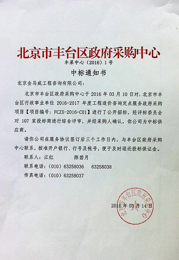 3月10日,北京市豐臺區(qū)行政事業(yè)單位2016-2017年度工程造價咨詢定點服務政府采購項目(項目編號:FCZX-2016-C01)進行了公開招標,據(jù)悉,一共有107家工程造價咨詢公司參與了投標,我公司經(jīng)評標委員會的綜合評審,并經(jīng)采購人確認,為此項目中標供應商。