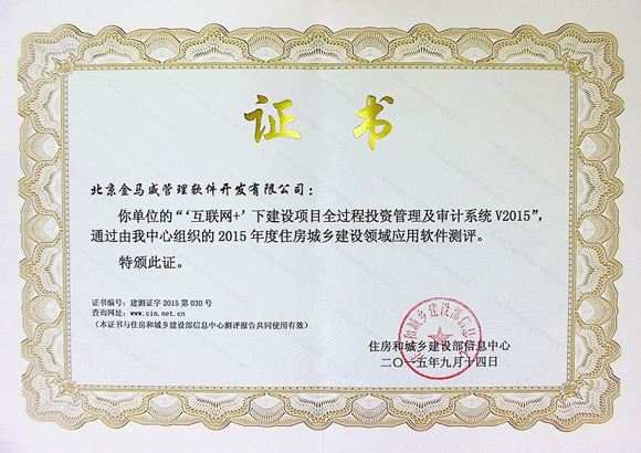 9月14日,金馬威“‘互聯網+’下建設項目全過程投資管理及審計系統V2015”通過住房和城鄉建設部信息中心組織的“2015年度住房城鄉建設領域應用軟件測評”,并獲得專家評審組成員的一致好評。