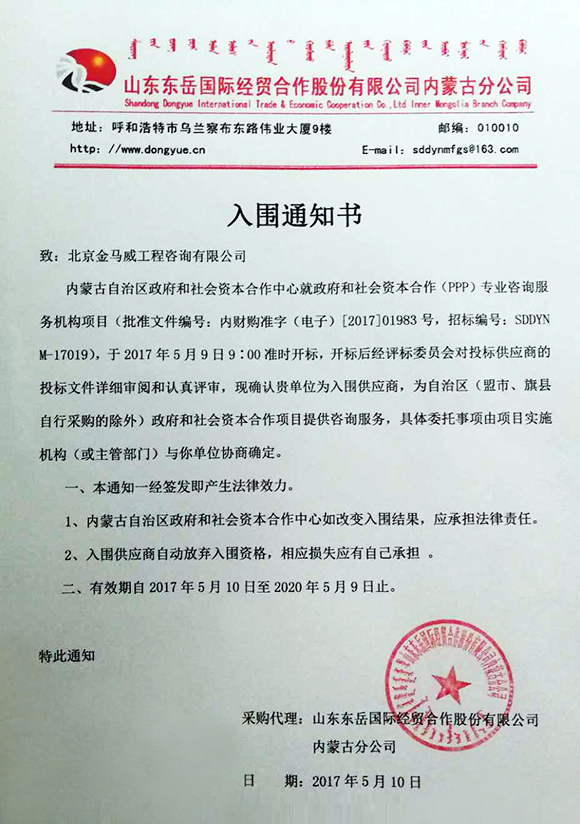 2017年5月10日,內蒙古自治區政府和社會資本合作中心就政府和社會資本合作(PPP)專業咨詢服務機構項目,開標后經評標委員會對投標供應商的投標文件詳細審閱和認真評審,確認我公司入圍“內蒙古自治區政府和社會資本合作專業咨詢服務機構項目”(招標編號:SDDYNM-17019)。